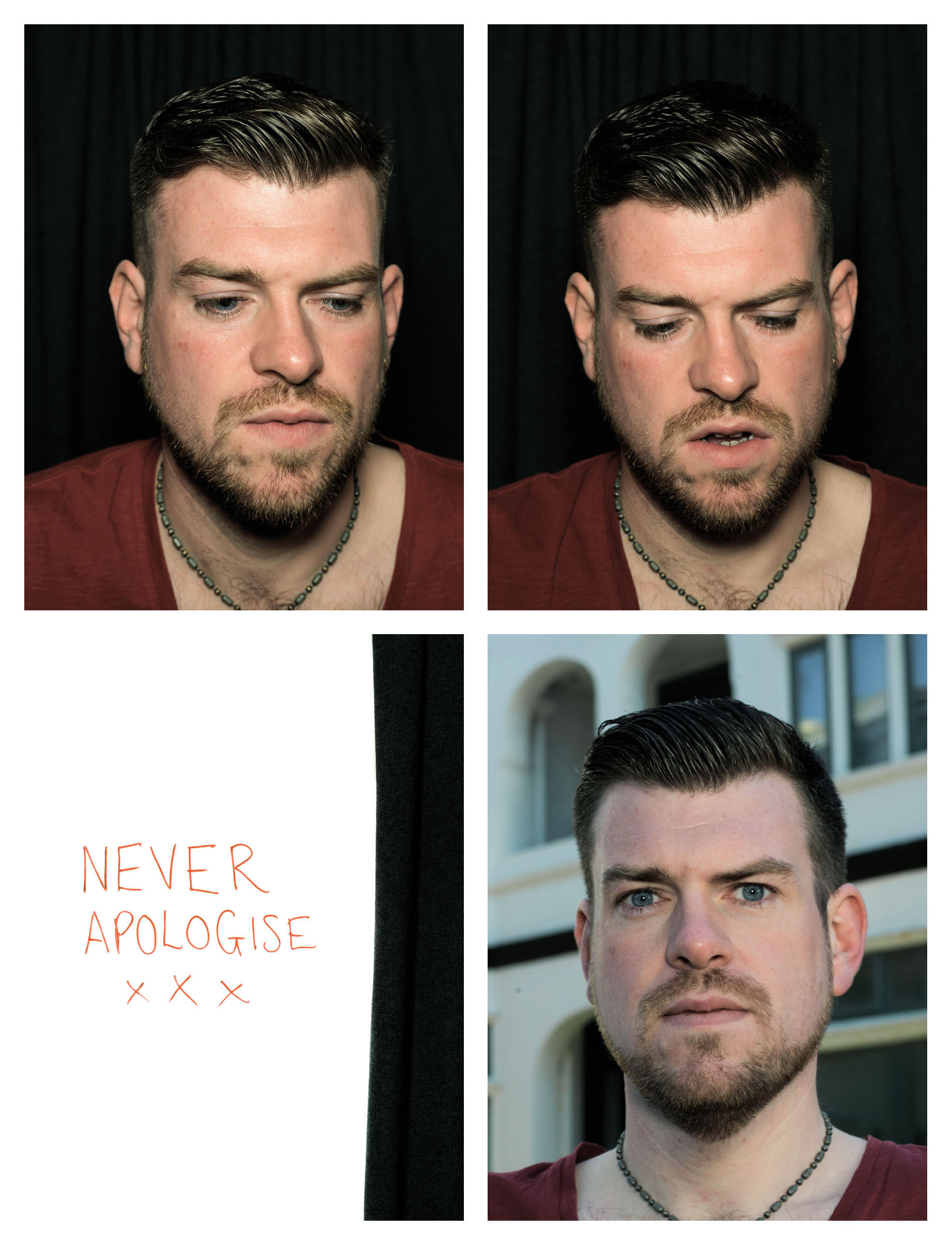 This portrait is of Matt Robinson, and was created as part of Not Going Shopping in collaboration with Anthony and the 11 participants. It is composed of two self portraits taken in a photobooth, a written note by the subject of the portrait, and a portrait taken at Brighton Seafront (bottom right). Matt's written note reads: "NEVER APOLOGISE X X X".