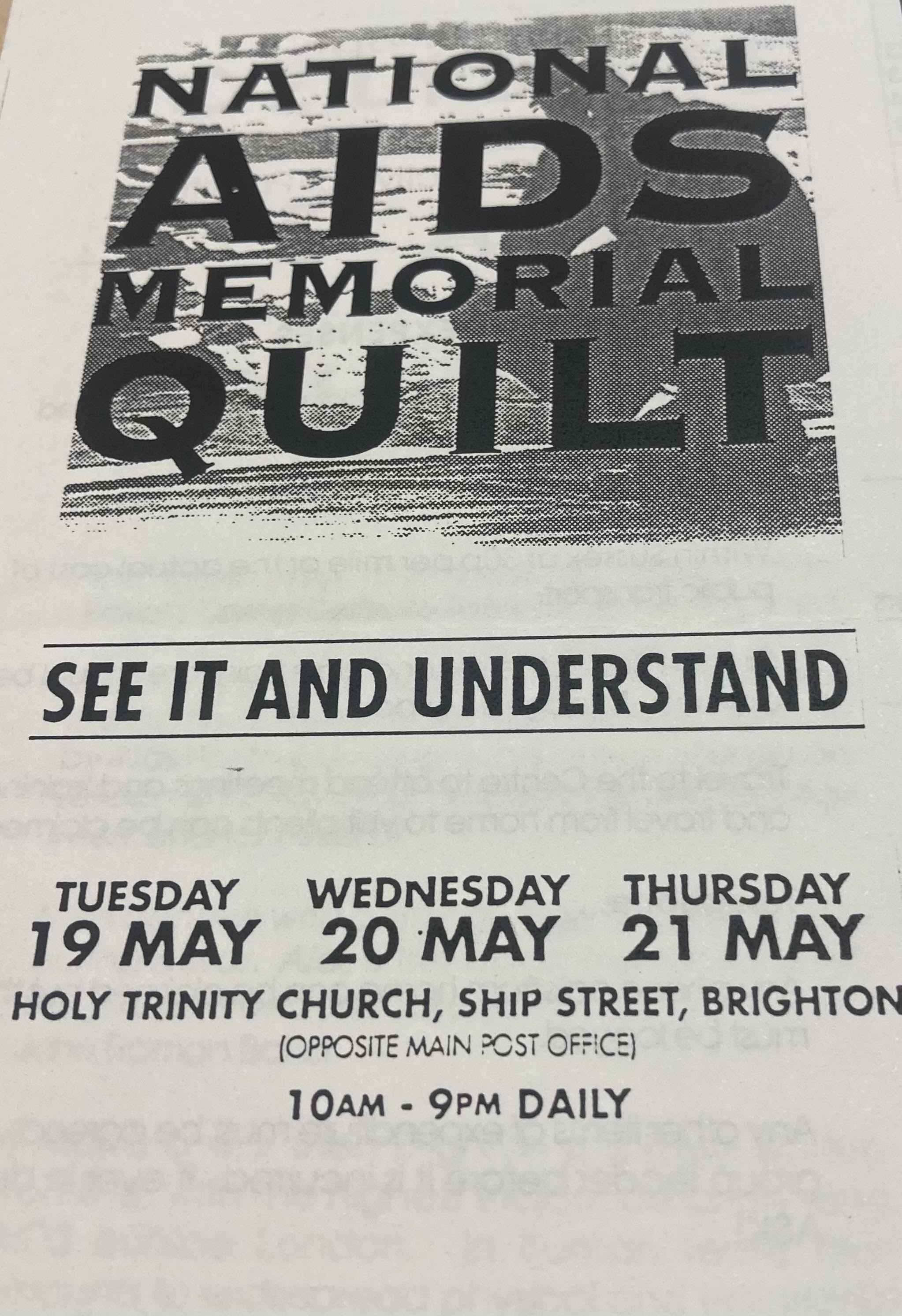 A series of exhibitions of the completed 6’ x 3’ panels celebrating the lives of people who died was arranged as part of the 1992 Brighton Lesbian and Gay Pride. On the 17th May (then known as Lesbian & Gay Remembrance Day - now International Day Against Homophobia, Biphobia and Transphobia) some of the quilt panels were displayed in the Brighton Museum, and then between the 19th and 21st May the whole National AIDS Memorial Quilt was laid out at the Holy Trinity Church, Ship Street - now the home of the Fabrica Gallery.