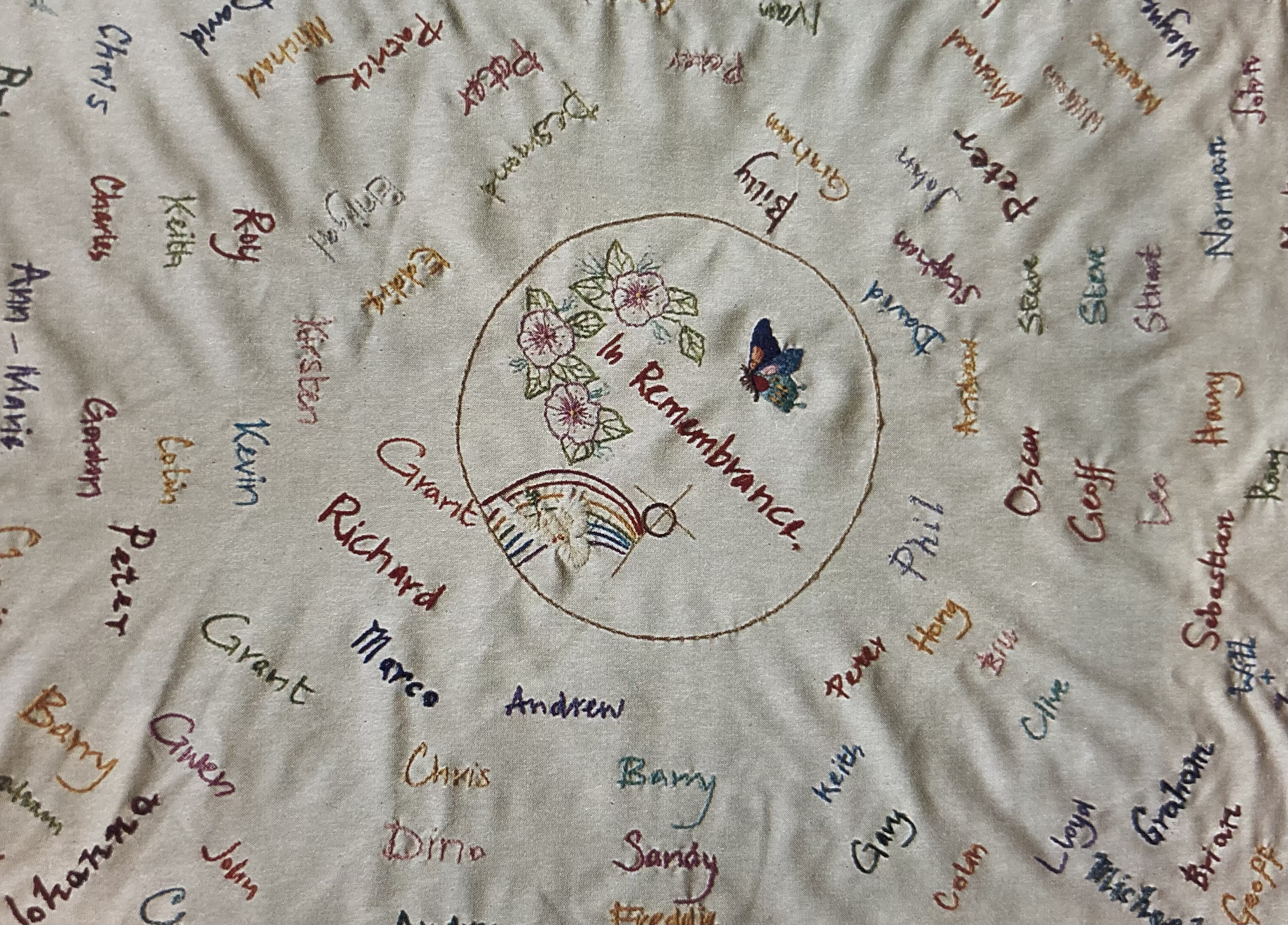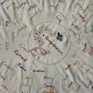 When I had pneumonia and I was bored in hospital someone suggested I do some needlework. I thought about it and decided to embroider a cloth with people’s name on it. That was about four years ago. Now there are 120 or 130 names on it, all people who’ve passed through Open Door at some time. I was classed as a professional funeral goer because I went to nearly all of them, but it’s my way of saying goodbye to friends. I did get to the stage where I thought I couldn’t cry anymore, but then you find that some are really hard. But some have been spiritually uplifting, because nowadays not everyone’s wearing black., quite often everyone wears bright colours. At one of them I went to, we all let off coloured balloons drifting off to heaven. Sometimes I get shaky when I go to funerals, like one last year. I went to someone’s funeral who was called Ken, and it kept going through my mind that it was like my own funeral. It was a strange experience. Sometimes I’m at a funeral and I think back to other people I’ve known…perhaps I hadn’t been able to let go at their funeral so I do at someone else’s. Most of them are younger than me, and often I feel guilty; why am I still going when they have gone? I’ve been told not to think that but I still do. There were three in one day once. It seems to go in cycles. That does get you down a bit.