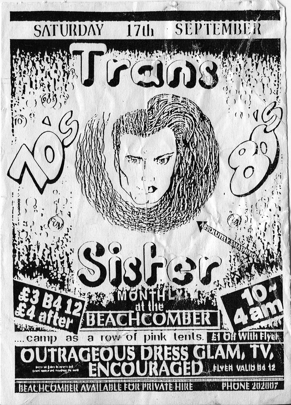 Flyer for monthly club night Transister at The Beachcomber 17 September 1994. £1 off entry with flyer. Outrageous dress glam, TV, encouraged.