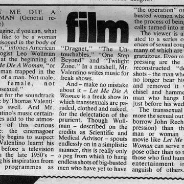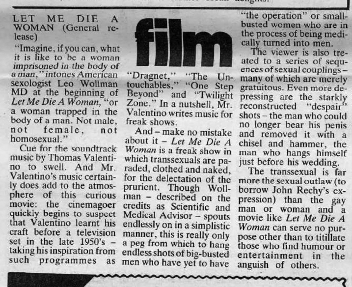 This is the concluding paragraph of the review: "The transsexual is far more the sexual outlaw (to borrow John Rechy's expression) than the gay man or woman and a movie like 'Let Me Die A Woman' can serve no purpose other than to titillate those who find humour or entertainment in the anguish of others." The advert for the film comes with the copy: Born a man... Let Me Die A Woman. All true! All real! See a man become a woman before your eyes!