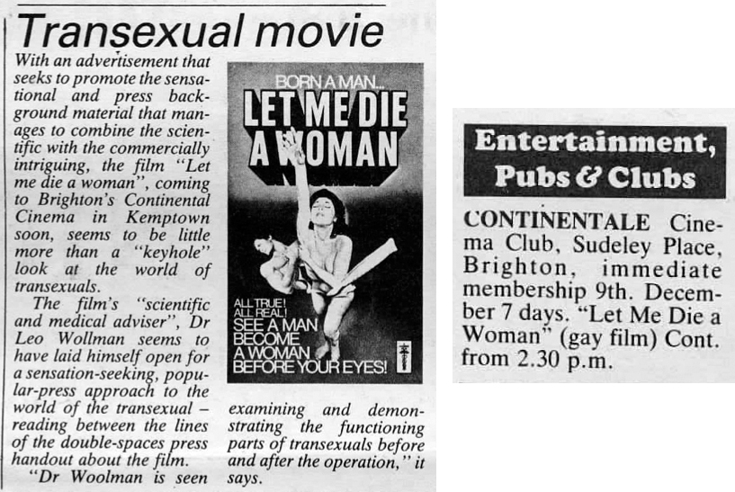 A small feature piece 'Transexual movie' advertising a screening of the film 'Let Me Die A Woman' at Brighton's Continentale Cinema, Sudeley Place, 9 December 1982. This and the accompanying listing come from Issue 2 of The Lavender Letter - courtesy of the Bishopsgate Institute.