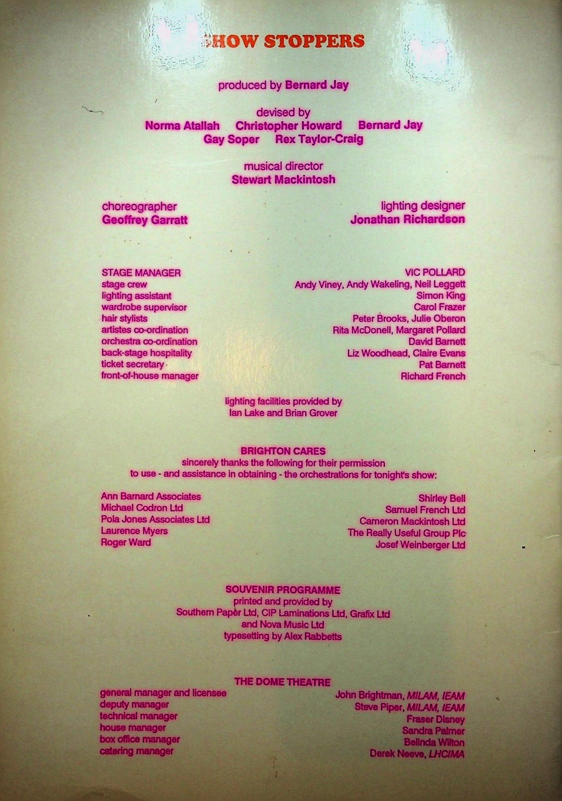 - Brighton Cares presents Show Stoppers, 12 April 1992