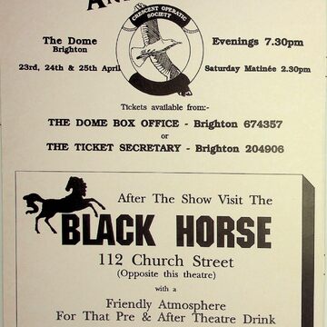 Adverts feature from The Black Horse, Crescent Operatic Society, Brighton Little Theatre, Madison Travel, Sussex Musical Theatre Group, David Foord-Brown Antiques, Brighton Theatre Group, The Wandering Minstrels', The Marlborough, Fudges, Brighton and Hove Operatics Society, Queens Head, Club Revenge, The Stage Door Cafe, The Bulldog Tavern, Queens Arms, Rowland House, The Beacon, The Juggler, Doris Isaacs School of Dancing, . D O'Mahony optician, Secrets