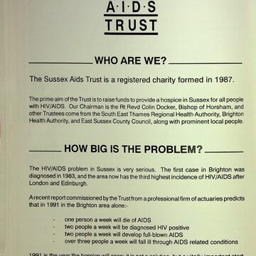 It features advertisements for events, venues, and local businesses, an introduction by Dora Bryan, an introduction to Sussex AIDS Trust, a programme of performances, a list of credits, and a list of volunteers. Separate newspaper cuttings are also present: Divine Cause of the Godfather about Bernard Jay from the Brighton & Hove Leader (18 January 1990) and A Stylish Show for AIDS Sufferers about the Brighton Cares show (source unknown).