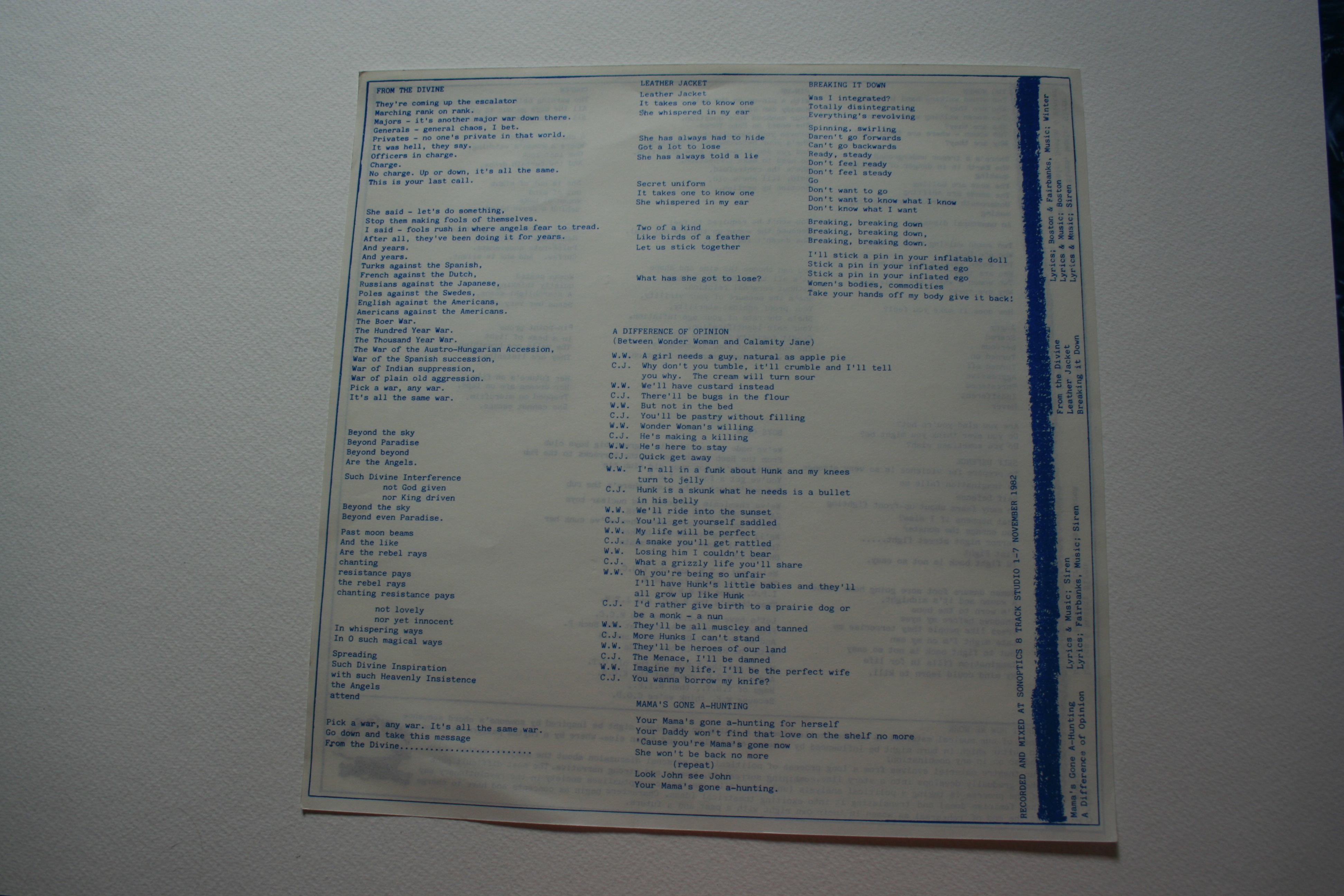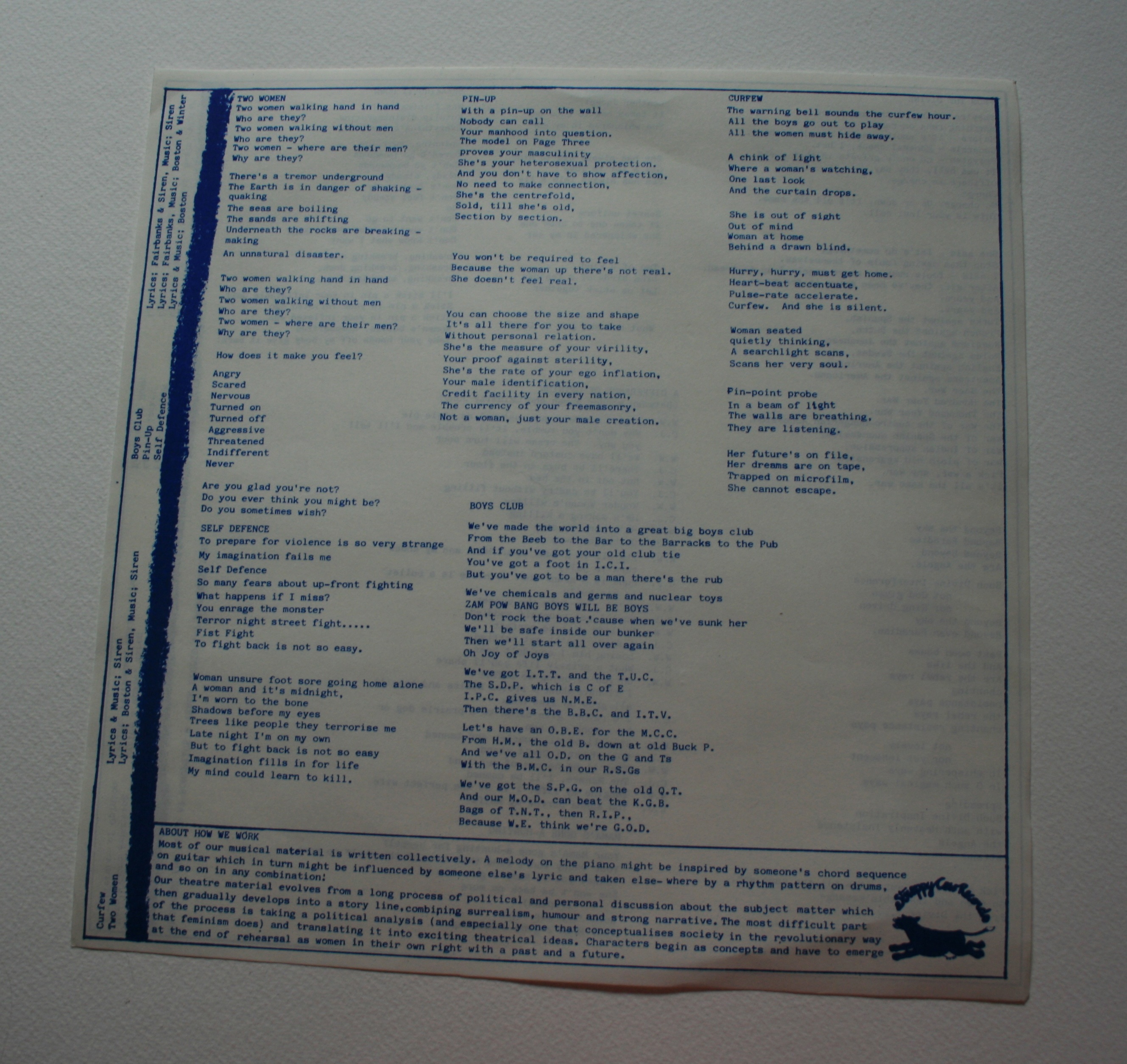- Album released on the feminist music label ‘Stroppy Cow’. Cover and lyric sheet design by Dawn Saunders. Photos by Deb Shorrocks. Lyric sheet printed by Women in Print.