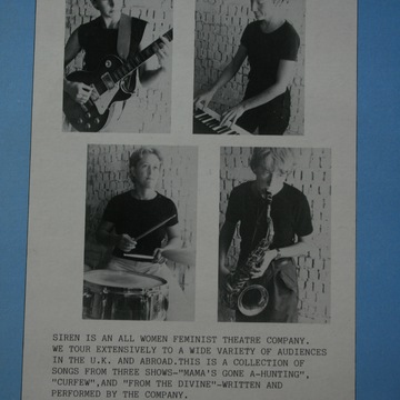 A scanned image set of the Siren Theatre Company 1982 vinyl record and sleeve 'Siren Plays', released by 'Stroppy Cow records’. It shows a list of the inner sleeve with the lyrics of 10 songs composed by various members of Siren and performed by Siren. It also shows photographs of Siren on the back cover, namely Jane Boston guitar, Jude Winter keyboards, Debra Trethewey drums and Tasha Fairbanks saxophone.