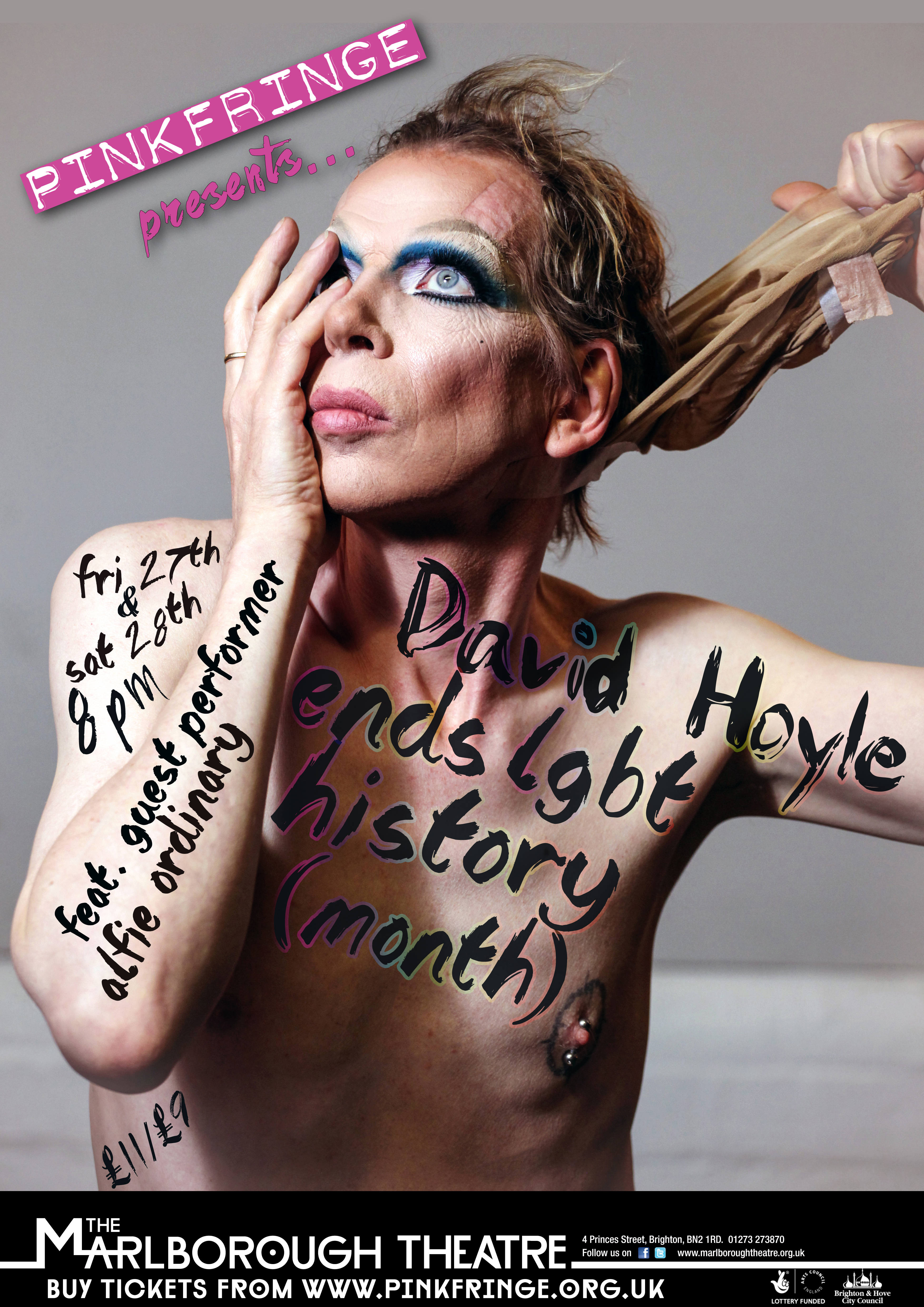 A promotional poster for David Hoyle's performance 'David Hoyle Ends LGBT History (Month)' taking place at the Marlborough Pub & Theatre on February 27th & 28th, 2015. The performance featured a guest spot from Brighton & Hove based cabaret performer Alfie Ordinary.