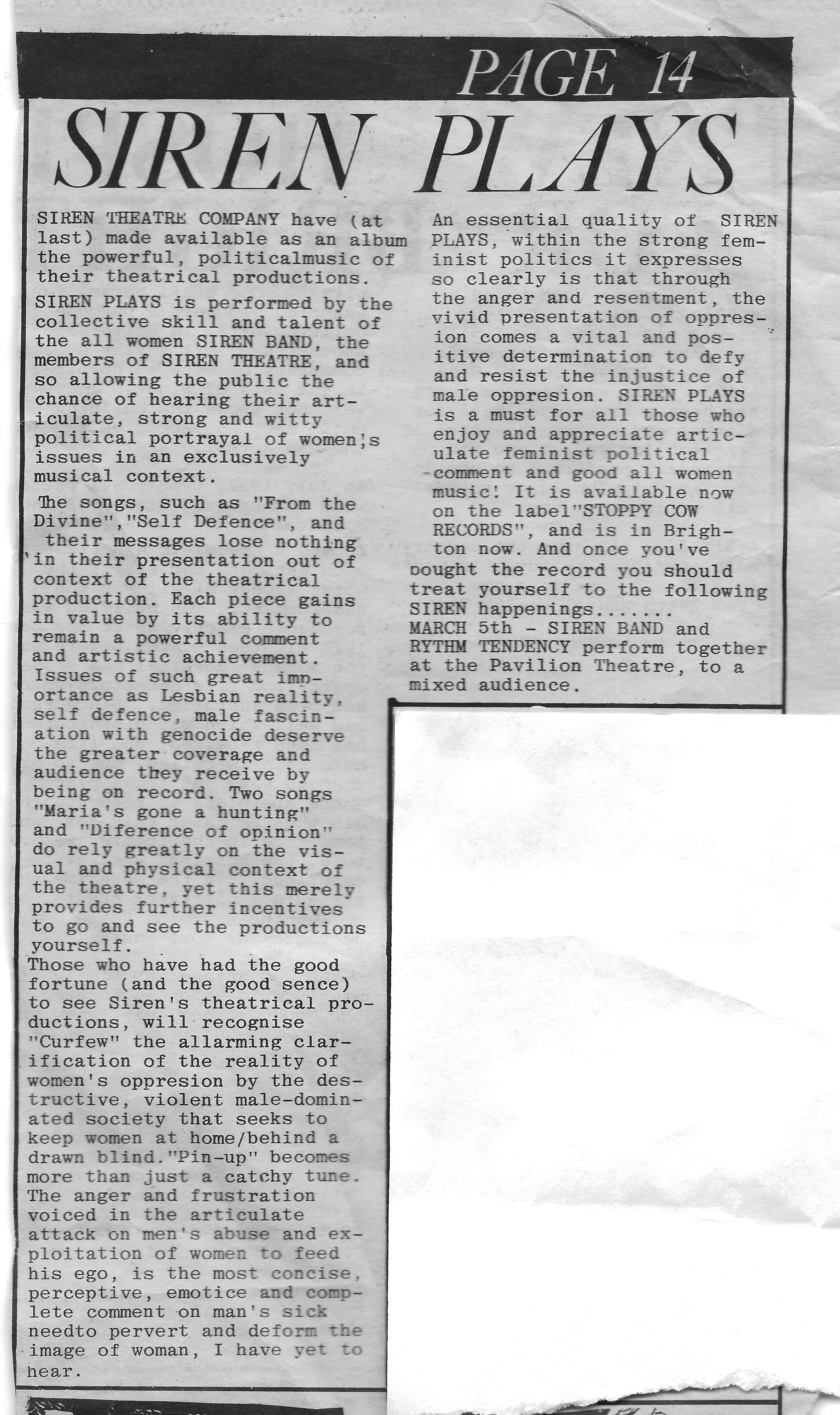 The review ends with a promotion of the gig Siren was playing as a band with Brighton band, Rhythm Tendency at The Pavilion Theatre.