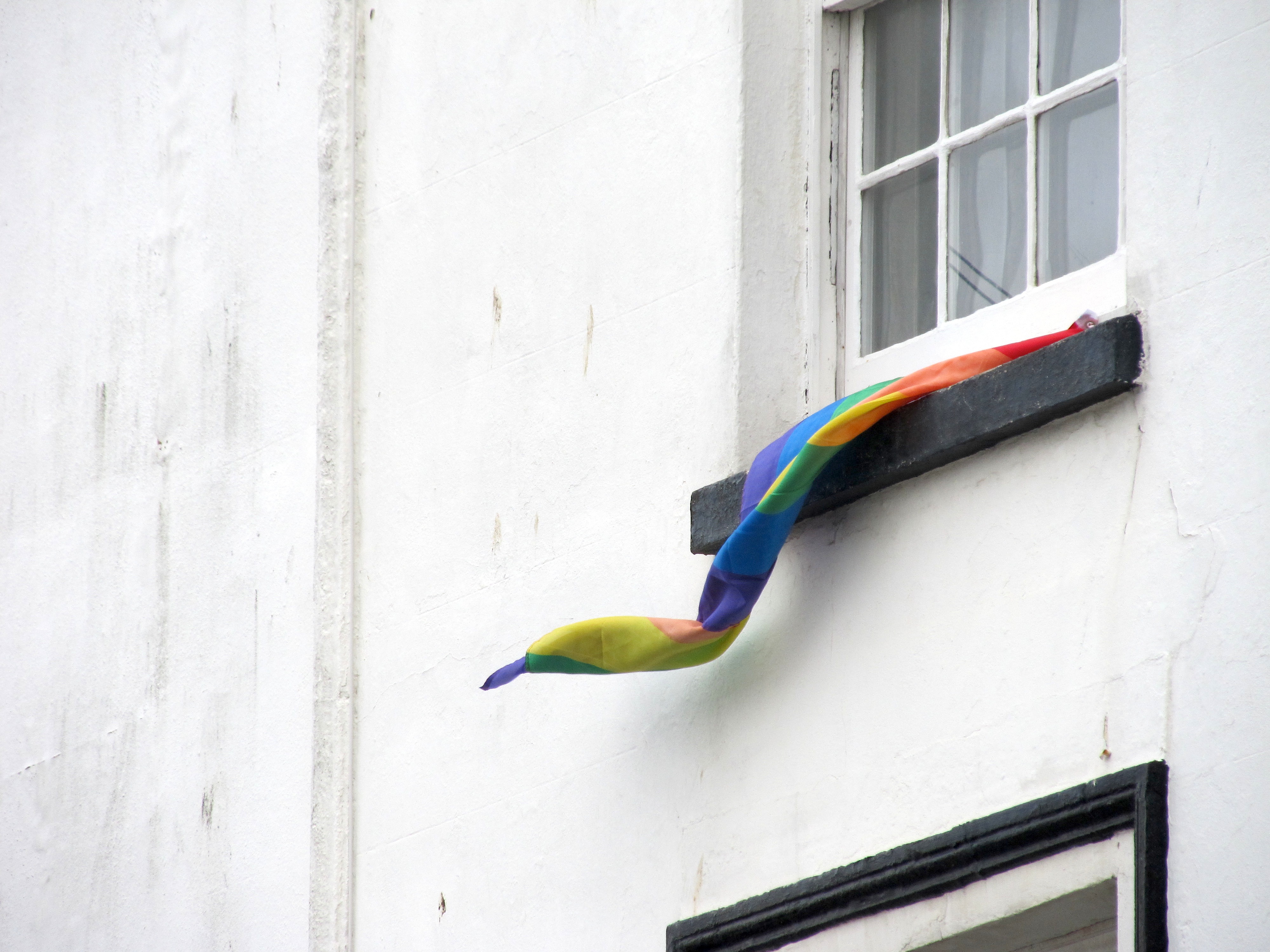 1. This photo depicts a rainbow pride flag hanging from a window and moving with the wind.