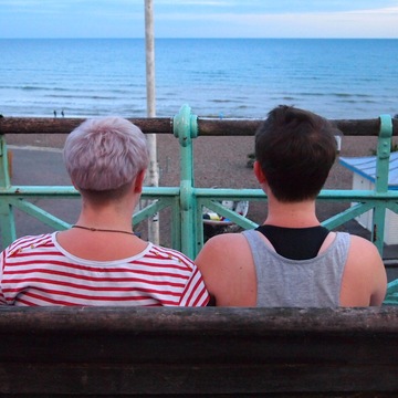 2. This photograph depicts two people sat on a bench at the seafront staring at the sea, taken from behind the subject.