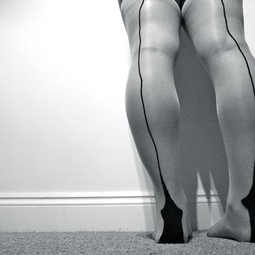 2. This photograph depicts someone facing a wall and captures their legs dressed in stockings.