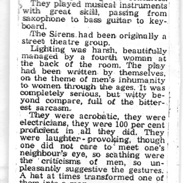 2. This shows an advert from the GLC Women’s Committee welcoming Siren to London with its anti-war play, ‘From the Divine’. It has an image of the GLC Peace Statue from the South Bank in London.