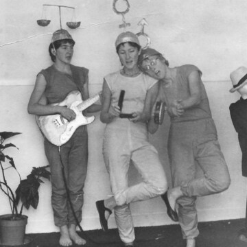 A scanned image set of the Siren Theatre Company 1982 vinyl record and sleeve 'Siren Plays', released by 'Stroppy Cow records’. It shows a list of the inner sleeve with the lyrics of 10 songs composed by various members of Siren and performed by Siren. It also shows photographs of Siren on the back cover, namely Jane Boston guitar, Jude Winter keyboards, Debra Trethewey drums and Tasha Fairbanks saxophone.