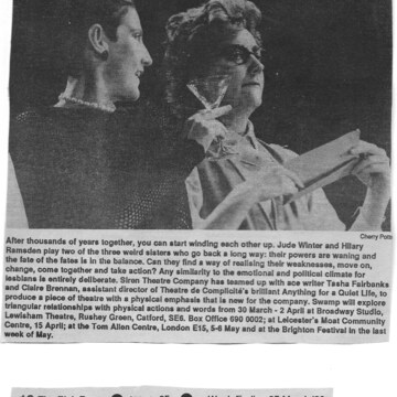 Digital reproduction of a review in The Stage of Siren's play 'From the Divine', when it was performed at the Oval House Theatre, London.
